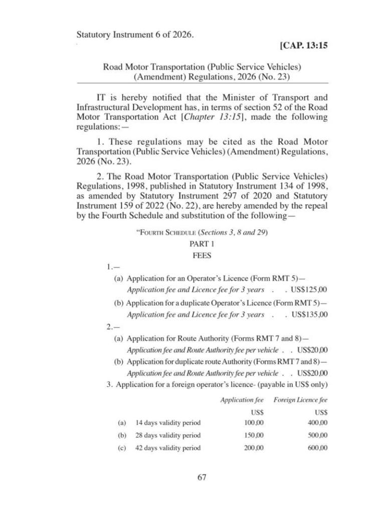 The government has gazetted Statutory Instrument 6 of 2026, amending the Road Motor Transportation (Public Service Vehicles) regulations in a move aimed at standardising fees, tightening compliance, and modernising the regulation of public service vehicles (PSVs).